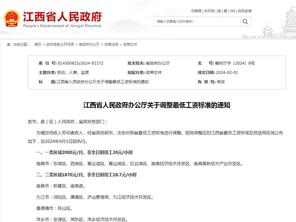 《江西省人民政府辦公廳關(guān)于調(diào)整最低工資標(biāo)準(zhǔn)通知》公布,從2024年4月1日 起執(zhí)行,調(diào)整后的江西省最低工資標(biāo)準(zhǔn)及其適用區(qū)域,一起來(lái)看看吧!江西省人民政府辦公廳關(guān)于調(diào)整最低工資標(biāo)準(zhǔn)的通知各市、縣(區(qū))人民政府,省政府各部門(mén)READ MORE...